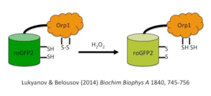 Genetically encoded redox sensors based on (versions of) the Green Fluorescent Protein (roGFP) have been reported as a powerful tool to measure the intra- and extracellular redox state(s) of cells (Lukyanov and Belousov et al., 2015).