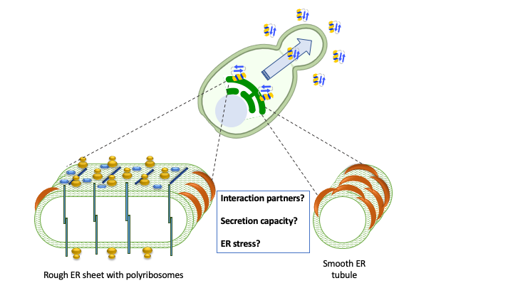 The initial destination for secretory proteins is the endoplasmic reticulum (ER), a peripheral network of tubules and membrane sheets (Perkins, 2021). The reticulon (RTN) and DP1/Yop1p protein families are responsible for tubule formation and regulate the ratio of sheets to tubules, while the dynamin-like GTPase atlastin/Sey1p is required for homotypic ER fusion and three-way junctions of the ER network, together with other auxiliary proteins. The ER is a very crowded and spatially restricted organelle, where proteins can also interact with wrong partners and aggregate. This causes ER stress. Increasing ER size through lipid-engineering in yeast lead to increased secretion of recombinant proteins (de Ruijter, 2016) and reduced ER stress independently of chaperone levels (Schuck, 2009). The impact of ER morphology in these processes remains so far undetermined.