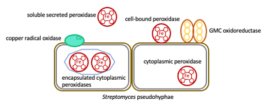 Bacteria like Streptomyces or Amycolatopsis each harbor several genes annotated as (dye-decolorizing) peroxidases or deferrochelatases/peroxidases. Some contain putative signal peptides (with or without cell-anchoring motif), and encapsulin-packaging motifs and downstream-located encapsulin genes are found (Rahmanpour, 2013), suggesting distinct roles. For Streptomyces lividans DtpA and a copper radical oxidase, roles in morphogenesis have been shown (Petrus, 2016), but other roles are discussed (modification of lignin constituents, oxidative stress protection) (Bugg, 2020; Lien, 2021). Whichever function, peroxidase activity requires spatial and/or temporal control for resource efficiency and to avoid cellular damage, and depends on auxiliary activities like enzymes providing hydrogen peroxide or reduced metal ions. As of now, only few of the above-mentioned targeting features are experimentally investigated.